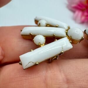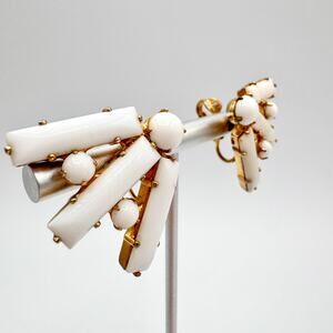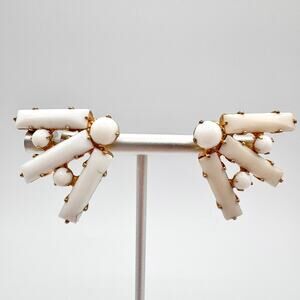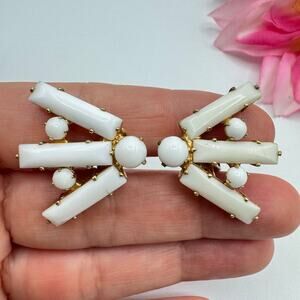 Vintage Vogue White Milk Glass Spray Clip On Earrings Gold Tone Signed Runway