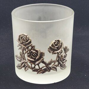 Vintage Votive Candle Holder Frosted Glass with Pewter Roses Design Decorative