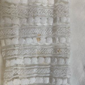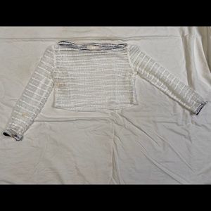A white sheer lacy crop top with thin black trim at neck and cuffs. Made of cotton and spandex. Some small marks on left sleeve. Size M
