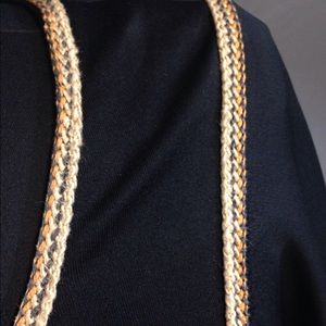 Black fabric with slight stretch, embellished with sewn-on woven trim in a jumper-sequel fashion. Back zip. No tags, size close to a modern 2-4.