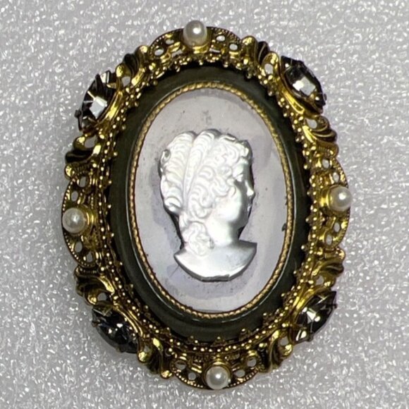 Vintage Gold-Tone Cameo Brooch With Faux Pearls & Rhinestones Victorian Style Glass Lady Profile Centerpiece