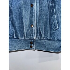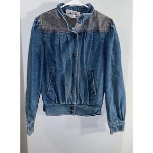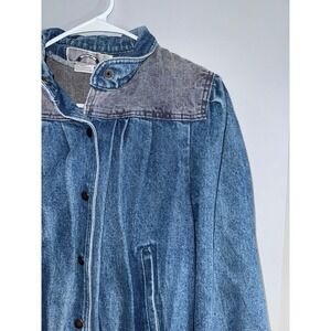 vintage 1980's to 1990's denim jacket with contrasting grayish collarbone and shoulder insets. The shoulders and chest have a small amount of pleats for a bit more volume. Also features small shoulder pads. Elasticized wide ribbed hem. Full snap front with an oriental style collar. Size medium but see the measurements as it is a bit oversized. W