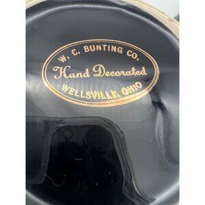 Vintage W. C. Bunting Co. ceramic ashtray from Wellsville, Ohio. Features the Harvard University “Veritas” crest in gold over glossy black glaze, with a built-in handle. Measures approximately 4.5" diameter (6" including handle). A great piece of Ivy League memorabilia or smoker’s / desk accessory, ideal for collectors of college crest ceramics.
