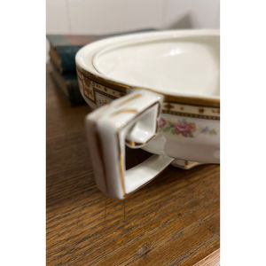 The bowl has a lovely wreath like clasp. The 6 sided pedestal has gold trim. There is a lovely sash design in gold leaf running through the clasp of the lid.