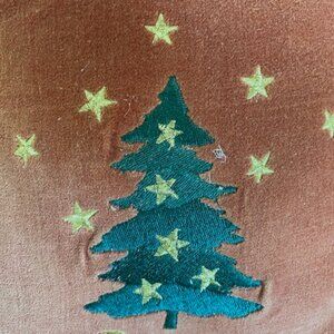 Vintage ('60s or '70s) square velvet pillow ~ WINE color VELVET (original color in last photos of the back, but the front was facing the sun so it got faded over the years and is now more of a "rusty" wine color). Thick GOLD CORD around the edges ~ GREEN Embroidered pine tree ~ GOLD embroidered stars and "PEACE" on the front. The back is solid.