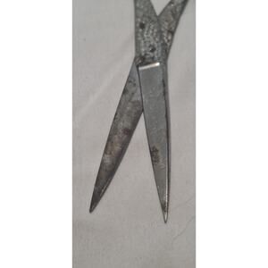 Vintage Wiss USA forged steel scissors with hammered handles, approx. 6" long. Solid mid-century craftsmanship with excellent balance and grip. Blades are sharp and cut smoothly; pivot tension feels just right—not stiff or loose. Classic hammered steel finish shows light age spotting consistent with use, adding to the authentic patina. Perfect for sewing, crafts, or display in a vintage tool or Americana collection.