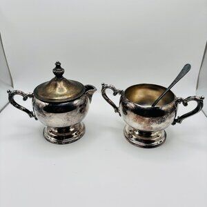 Vintage WM Rogers Silverplate Creamer Sugar Set Lid Spoon Ornate Handles Tarnish