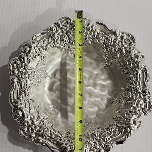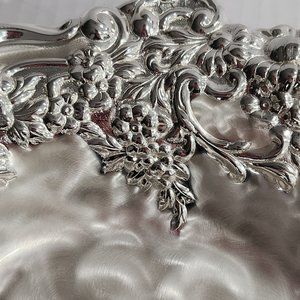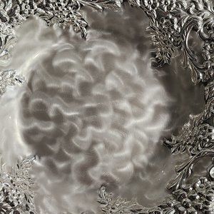 A showstopper silver plated brass serving bowl. This gorgeous shallow bowl is made by WMF IKORA Germany. It feature a very detailed raised art Nouveau style floral design that drips into the soft brushed Satin finish overlapping circle design in the center of the bowl. The bowl rests on three ball feet. This is a very elegant and eye catching serving piece for displaying or use. The original sticker is still on the bottom WMF-IKORA tarnish resistant to clean use of soft damp cloth. Do not use any abrasives or detergents. 11 / 71 measures 12 inches wide, 2 inches tall. Condition is excellent. Non smoking pet free home.