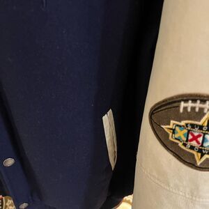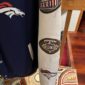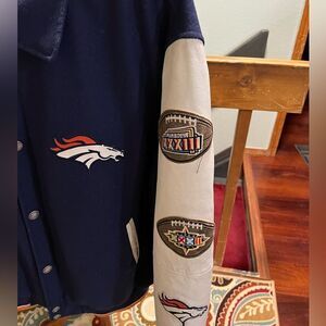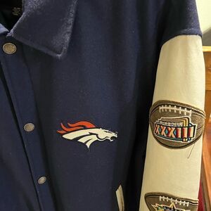 Show your team spirit with this stylish Denver Broncos varsity jacket. Featuring a bold navy color and iconic team patches, it's perfect for any fan. Size XL. Jacket was just professionally dry cleaned. From a smoke free home.