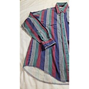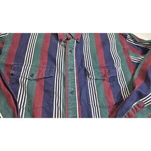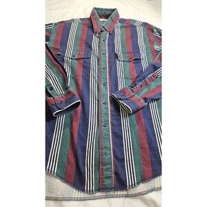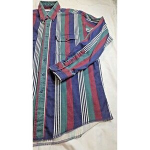 Step into timeless style with the Vintage WRANGLER Cowboy Cut USA Striped XLTails Western Single Needle Shirt. Designed for the discerning individual with a taste for classic Americana, this shirt features a sharp multicolored striped pattern and the iconic cowboy character that embodies the spirit of the West. With a comfortable regular fit and collared neckline, it's tailored for versatility, whether you're headed to the office, a casual outing, or a cocktail party.