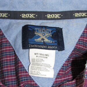Vintage WRANGLER Twenty X 20X Blue Maroon Plaid Cowboy Western Shirt Mens Size Medium Tall MT. Button front.