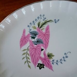 Vintage WS George Pink Caladium design with bolero style edges. This is a 11.5-inch platter with a beautiful gold trim. The platter is preowned and in excellent condition. This item should be hand washed.