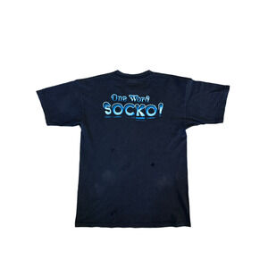 Original vintage WWF “Talk to the Sock” Mankind T-shirt featuring Mick Foley with Mr. Socko. Classic late-90s Attitude Era wrestling tee with bold front graphic and “One Word: Socko!” print hit on the back.