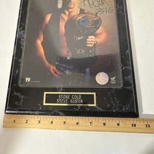 This is a picture of Steve Austin holding a championship belt. It is signed and framed on a wood back. It has Austin 3:16 written on it. It is from th 90s Attitude era in the WWF before it became WWE. It is 13” x 10.5”. Easily hang on the wall. Pre-Owned-Excellent condition