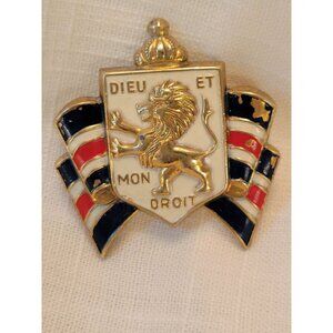 Collectible WWII pin from Bundles for Britain Inc., featuring the British crest with "Dieu Et Mon Droit". Measures 1.75 inches.