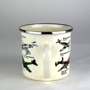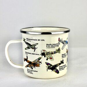 Celebrate the spirit of aviation history with this collectible enamel mug from Gift Republic, adorned with vivid illustrations of iconic World War II planes including the Spitfire, P-51 Mustang, Bf 109, and more.