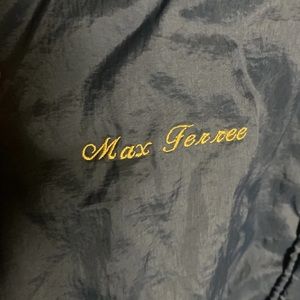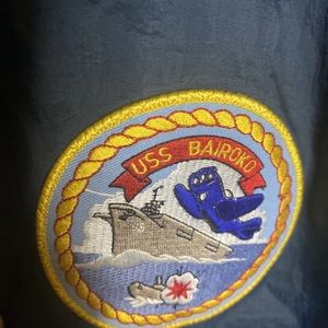 Measures about 30” pit to pit and 29.5” pit to pit. USS Bairoko patch is 4” in diameter. Navy blue. Metal Snap button closures. Some paint loss. Embroidered veteran’s name Max Ferree. Waist has a drawstring adjustment. Waist pockets are covered with flaps. No holes or stains. Made in USA.