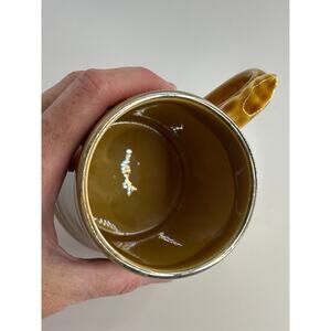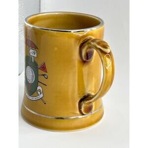 Vintage ceramic mug (or stein) by Wade of England featuring a classic golf motif—golf ball, clubs, umbrella, and signage like “Straight Down the Middle.” Measures approx. 4⅝″ tall x 3⅜″ diameter (excluding handle). Light wear consistent with vintage use; no chips or cracks. Made in England. Ideal for collectors of sports barware, breweriana, golf memorabilia, or Wade ceramics. Rendered in warm mustard glaze with subtle detailing. Adds character to any barware or vintage drinkware collection.