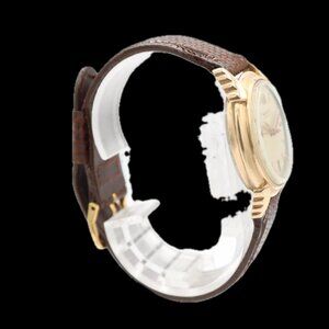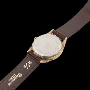 Fair, overall condition for its age. Running, but we dont know the last time it was serviced. This means, it can run unreliably, start or stop and timekeeping is not guaranteed. There are scratches on the case. There are scratches on the crystal. The dial has scratches and discoloration. There is spotting on the dial. The hands have rust on them. The band is not original. Running a couple minutes slow a day with a 150 amplitude.