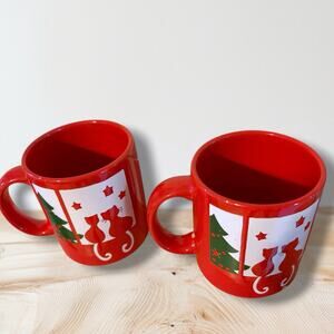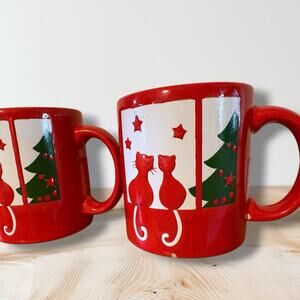 Vintage Waechtersbach Germany Christmas Mugs Red Cats & Tree Coffee Cup Pair 2