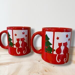 Bright red with a festive design featuring two cats looking out a window at stars and a Christmas tree. Classic glossy red glaze with white and green details.