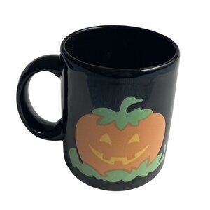 This charming black ceramic mug features a cheerful pumpkin design, evoking nostalgic autumn evenings. Crafted in W. Germany by Waechtersbach, it reflects timeless Halloween spirit and artisanal quality.
