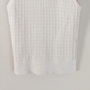 Beige sleeveless cable knit top with a body-skimming silhouette and soft turtleneck. Pullover style. Lightweight, thin, and comfortable.