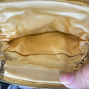 Details: Stunning cream purse with gold lame stripe completely decorated with tiny gold seed beads. The inside is cream satin with one open side pocket. There is a silver-tone linked shoulder strap that is detachable.