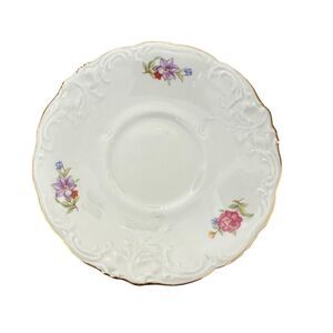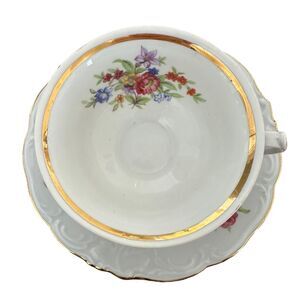 Vintage Walbrzych Footed Teacup Saucer Set White Floral Gold Trim Porcelain