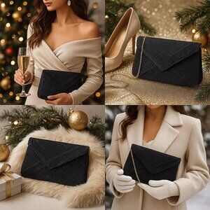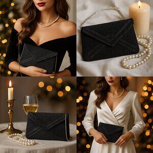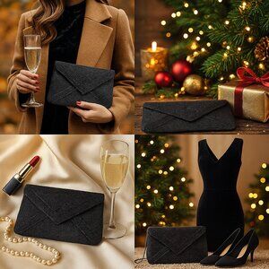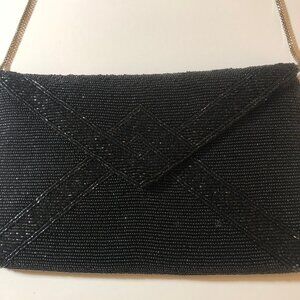 This exquisite Waldorf beaded evening bag shimmers subtly under soft light, featuring intricate black glass beadwork in a geometric envelope pattern. Its sleek shape, lustrous satin interior, and gold-tone chain make it the perfect companion for cocktail soirées, winter galas, or romantic holiday dinners.