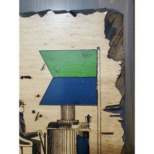 Vintage Wall Plaque Screen Print on Wood of Steam Engine MCM 1970's 11" x 12"