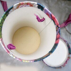 It looks a lot older than it is. I bought it in the early 90s, when Victorian style was everywhere. It's obviously made from vintage wallpaper come and wonderful faded Grosgrain Ribbon. It is quite obviously cylindrical, the top comes off and the ribbon ties it closed. No flaws. Great for scarves or pantyhose, it is 7 inches high and 5 inches wide. Offers always welcome.