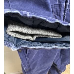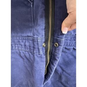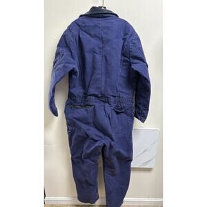 Made in the USA, these coveralls feature a heavy cotton blue shell with a corduroy collar, quilted insulated lining, double front zipper with snap storm flap, zippered chest pockets, side entry pockets, and back pockets (one zippered). Snaps run along the sides and cuffs for easy on and off. Size 48 Regular, inseam 30”, full length from shoulder to bottom 60”.