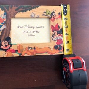 This is a vintage Walt Disney World (circa 2004) photo frame that holds a 4" x 6" photo. The frame is made out of wood with a laminate coating over the image. Tape measure shown in photo for reference measurements only. Comes from smoke free, pet free home. Promoted on other sites.