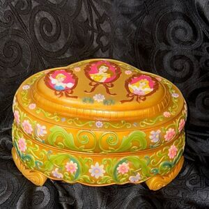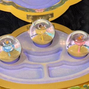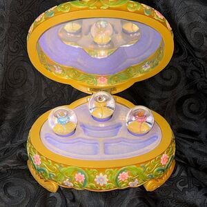 Beautifully crafted jewelry box. Features intricate floral designs. Vibrant colors with elegant princess portraits. Vintage 1991 Disney Princess Jewelry Box Plays " A Tale As Old As Time". Features Belle from Beauty and the Beast, Cinderella and Aurora. When opened the princesses spin inside the snow globes. . Has 3 shallow indentions to hold a small amount of jewelry. heavy (over 5 pounds.