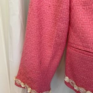 Good Used Condition with only minor signs of wear - please see photo. There are a few small droplet colorations on the right sleeve, but could likely be dry cleaned out (I have never tried, as I only wore this once and then it went into the back of my closet). Cute jacket for the spring to pair with jeans and a white tank top.