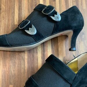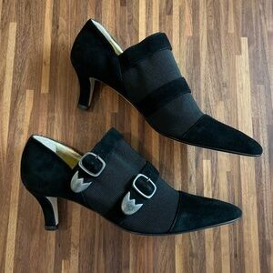 Black suede and fabric double buckle heels by Walter Steiger. Vintage. Heel 2". Size print says 8.5, but I'd say they are more like an 8, they have stretch but the material is sturdy. 11" long from toe tip to heel, very narrow at the toe.