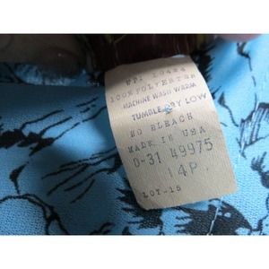 This is a lovely vintage dress by Warell, size 14 petite. It's 100% polyester and is lightweight. The top has pleats. It has a coordinating belt. The backing on the belt shows a little wear and bend marks, which are not visible from the front side. I measure the length from the shoulder to the bottom as 40-1/2". Chest is roughly 40". Thanks for looking!