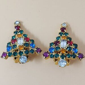 A meticulously crafted vintage jewelry set featuring a stunning Christmas tree design, adorned with a kaleidoscope of colorful rhinestones. The brooch and matching clip earrings showcase precision placement of blue, red, green, purple, and clear stones, set in a gold-toned metal framework.