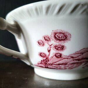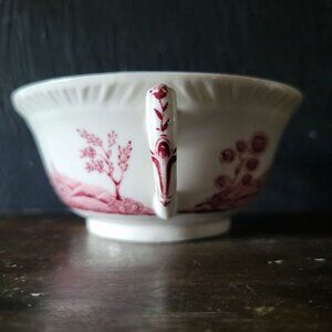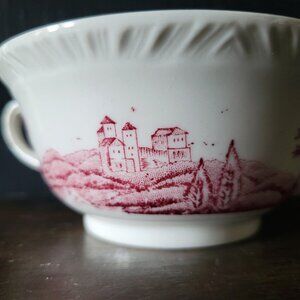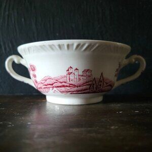 This vintage Warwick Tudor Rose cream soup bowl, featuring a beautiful red pastoral design, adds elegance to any table setting. Its double-handled design makes it easy to handle, while the durable ceramic ensures long-lasting use. Ideal for collectors or those looking to add a touch of history to their dining experience.