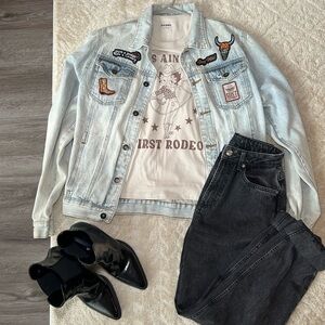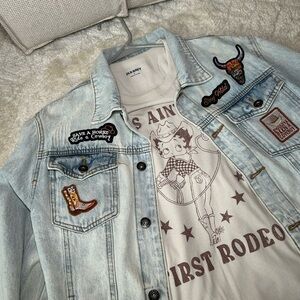 Brooklyn Cloth Denim jacket with western patches. Vintage wash for a timeless look.