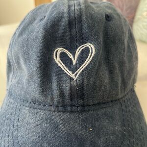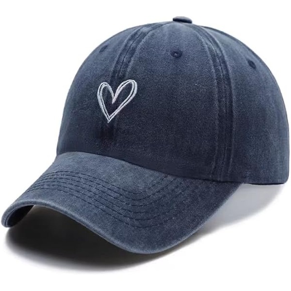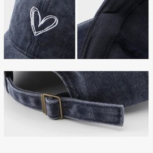 vintage denim baseball cap, heart embroidered hat, casual adjustable cap, washed cotton hat, minimalist fashion hat, romantic style cap, hiking and camping cap, retro-inspired baseball cap