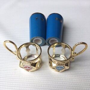 - Appear to be made of painted wood with ceramic gold toppers - little holders are made of plastic that looks like metal - very lightweight