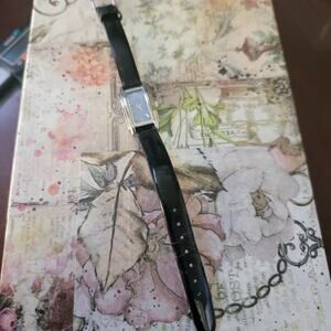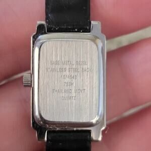 This vintage Anne Klein II women’s wristwatch, model 10/4543, reflects the refined simplicity that defined late 1990s to early 2000s fashion. It features a slim rectangular silver-tone case that gives the watch a clean, tailored profile ideal for everyday or professional wear. The cool-toned dial is accented with Roman numerals at the 12 and 6 positions, adding a subtle classical touch, while minimalist stick hour markers and sleek silver-tone hands maintain a modern, uncluttered look. Powered by a reliable quartz movement made in Thailand, the watch offers accurate, low-maintenance timekeeping. A black leather strap completes the design, providing classic contrast and comfortable wear. With its balanced proportions and understated detailing, this Anne Klein II timepiece transitions effortlessly from office settings to casual elegance, making it a versatile vintage accessory for collectors or anyone who appreciates timeless, minimalist design.