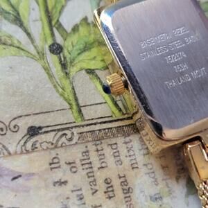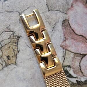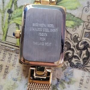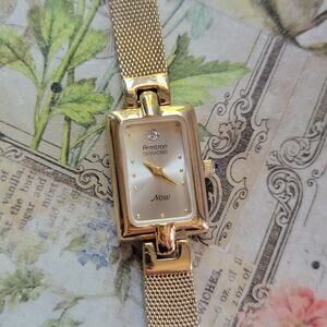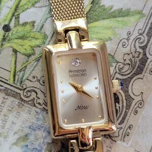 This vintage-style Armitron Now women's quartz watch features a polished gold-tone rectangular case with a minimalist champagne sunburst dial and single diamond accent at 12 o’clock. Dotted gold-tone hour markers and tapered hands enhance the sleek, modern aesthetic. The watch runs on a reliable Thailand quartz movement, marked on the stainless steel back. Its mesh link bracelet offers lightweight comfort and a refined, contemporary feel. Finished with a faux sapphire crown and signed “Armitron Diamond,” this piece combines subtle luxury with everyday wearability. The design reflects early 2000s fashion trends—elegant, understated, and perfect for pairing with both casual and formal looks. Battery is included and the watch is fully functional. Ideal for fans of dainty vintage timepieces, minimal design, or affordable jewelry-inspired wristwear with timeless appeal.