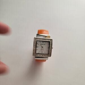 Bold and vibrant, this vintage cuff-style quartz watch features a vivid orange enamel-style band paired with a sleek rectangular chrome-tone case. The hinged bangle design offers a sculptural look reminiscent of fashion-forward styles from the late 1990s to early 2000s. Ideal as a statement piece, this unisex watch blends playful color with futuristic minimalism. The timepiece fits snugly with an easy slip-on mechanism. Watch face details are not visible, so brand and function specifics are unknown, but the case appears intact and ready for battery-powered operation. A standout addition to any Y2K-era accessory collection.