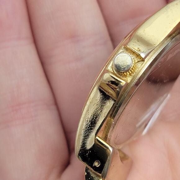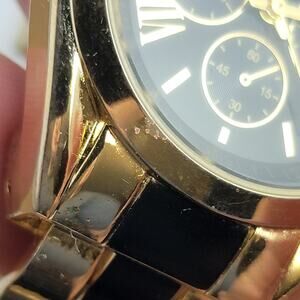 This vintage-inspired Sachi quartz watch features a bold black dial with gold-tone Roman numerals, luminous hands, and three faux subdials for a chronograph-style look. The case is polished gold-tone metal, complemented by a matching bracelet with sleek black enamel-style center links. This piece blends sporty design with classic details, ideal for everyday wear or as a fashion-forward accessory. Likely from the late 2000s to early 2010s, the watch is quartz-powered and in full working condition—perfect for those who appreciate statement timepieces with a modern edge.