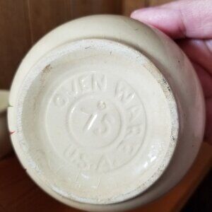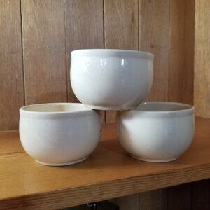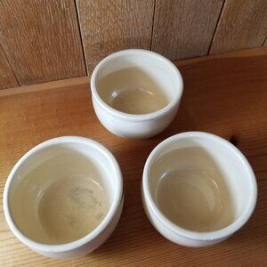 Vintage Watt Pottery American Red Bud #75 Bean Cups are 2 1/2" tall x 3 3/4" wide. It features the American Red Bud design on the round, slightly bulging bowl. Slight imperfections under glaze and some crazing. One bowl has a stain in the bottom. Set of 3 bowls. No chips, cracks or repairs. Please view the pictures and feel free to ask questions. Thank you for visiting my shop.
