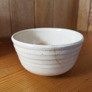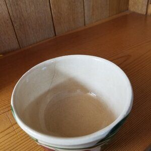Vintage Watt Pottery Apple #4 Mixing Bowl is 2 1/4" tall x 4" wide. It features the three-leaf apple design on the ribbed yellow ware pottery bowl. Slight imperfections under glaze and some crazing. Small hairline crack on back side. No other chips, cracks or repairs. Please view the pictures and feel free to ask questions. Thank you for visiting my shop.