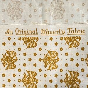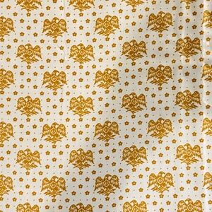 This gorgeous piece of fabric is an original Waverly print titled “Colonial Eagle” in a gold design on ivory. The motif features a heraldic eagle with shield surrounded by floral accents. The selvage reads “An Original Waverly Fabric Colonial Eagle Vat Colors.”
